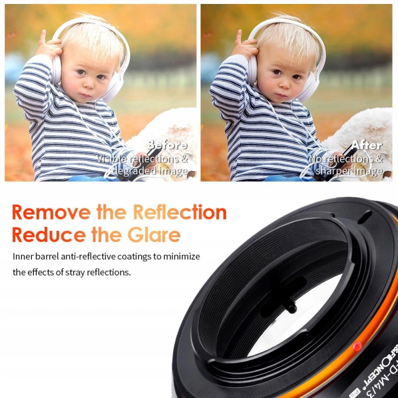 Środek adaptera posiada specjalnie zmatowioną powłokę, która minimalizuje ryzyko odblasków i refleksów. Co wpływa na kontrast uzyskanego zdjęcia oraz ostrość. Ilustrują to zdjęcia wyżej.
